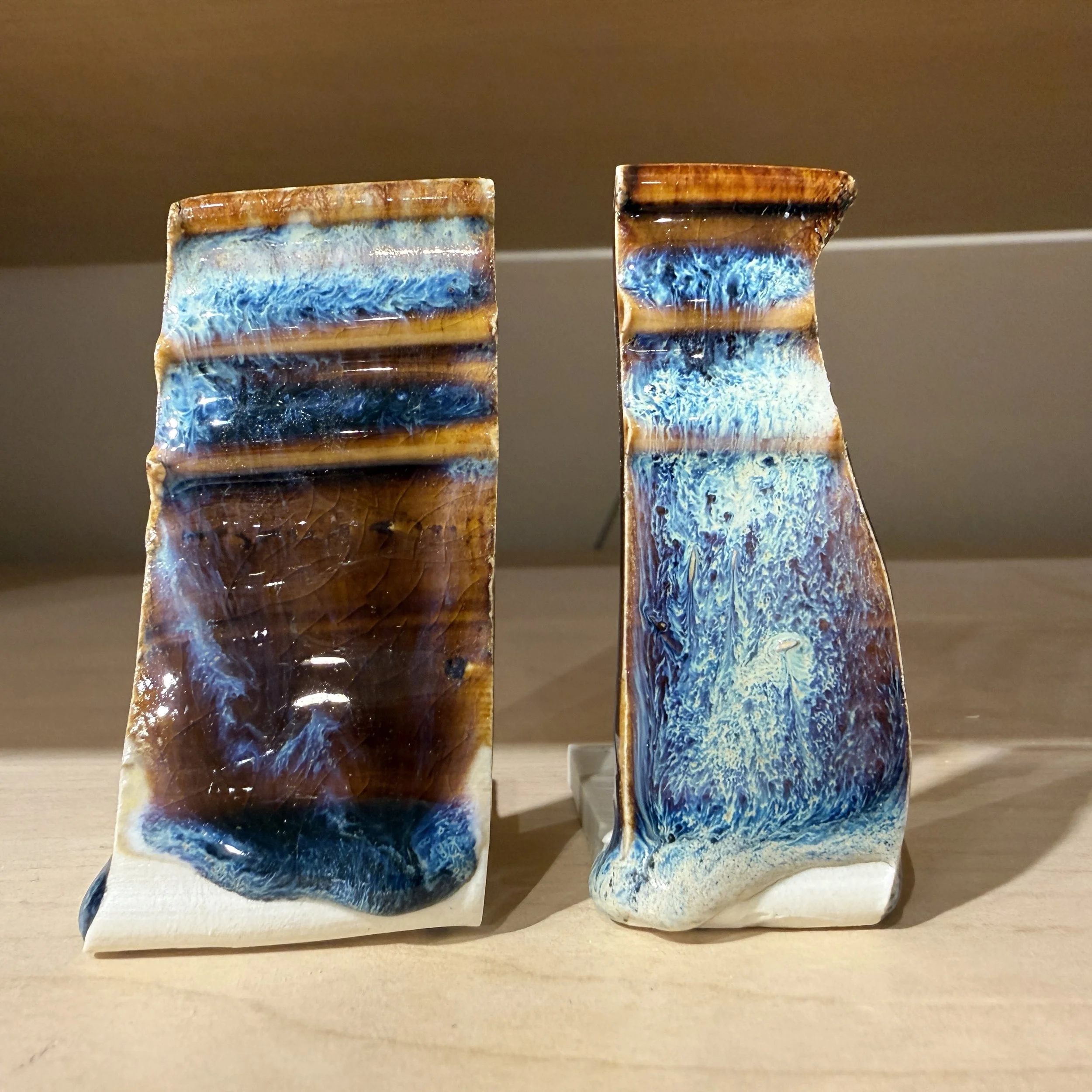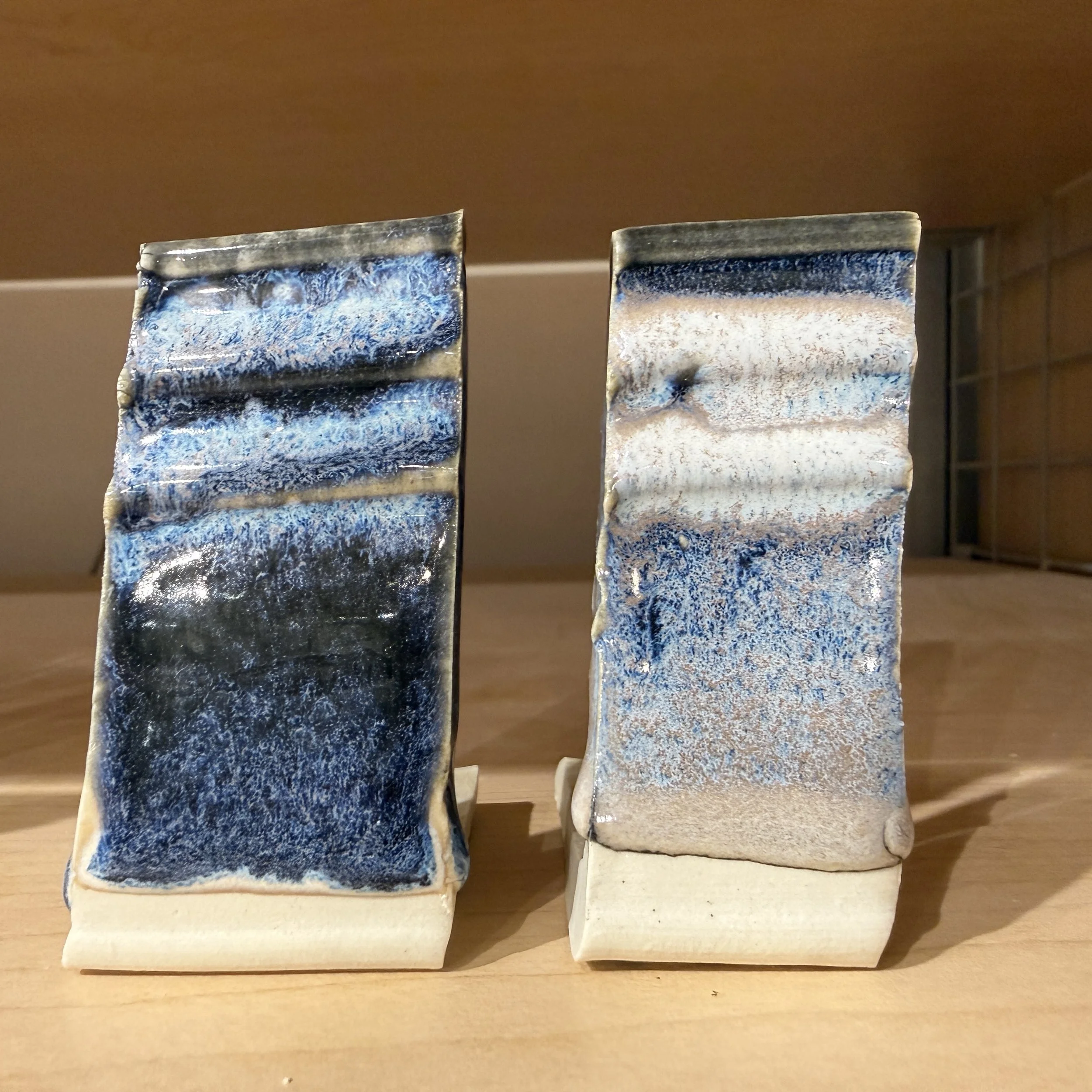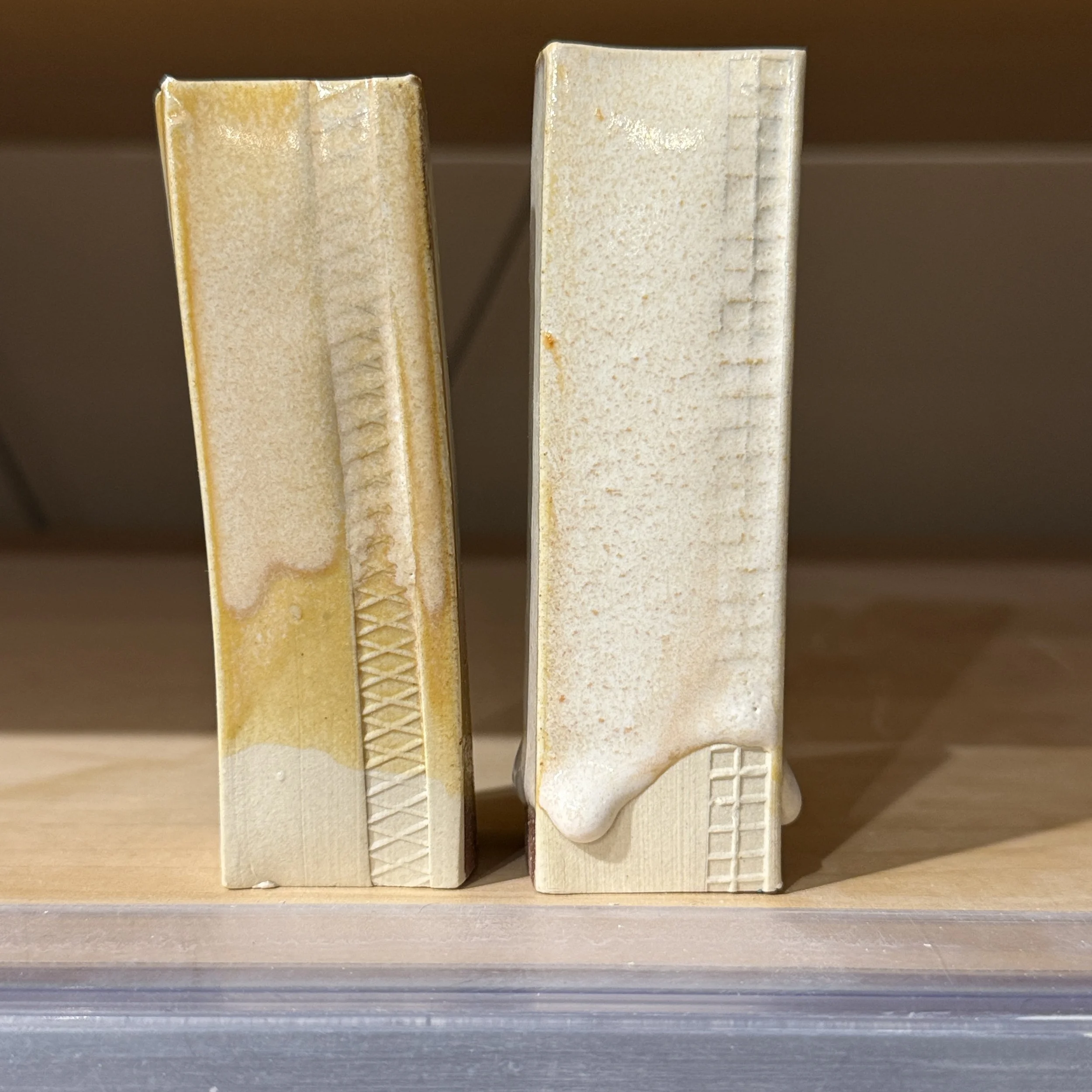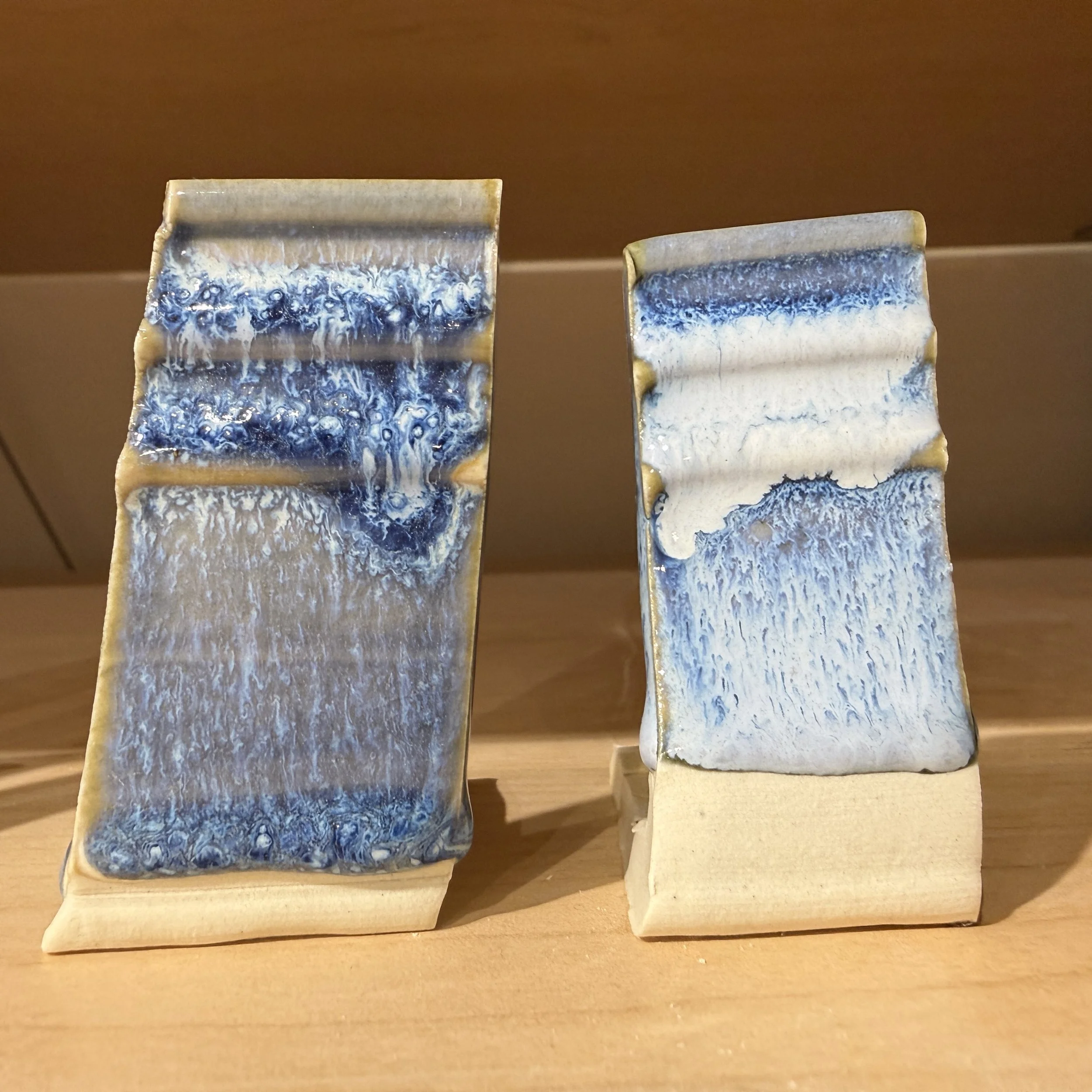 First, notice how all the tiles have a bump or thickening of glaze at the bottom of the test tile. This means the glaze is running and collecting near the foot. We suggest using Alabama Rain on the top 1/2” of you pot until you understand the glaze. Do not use Alabama Rain near the foot.
